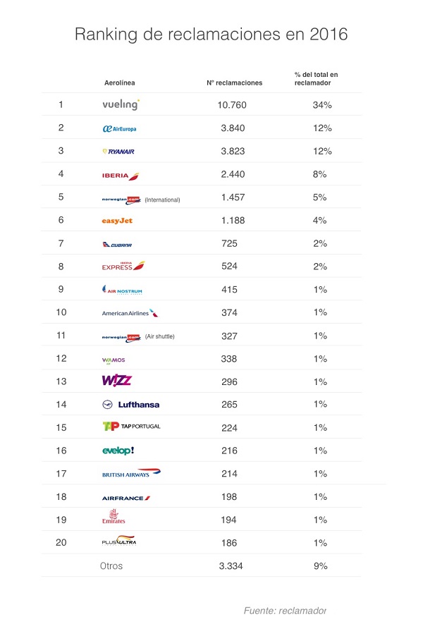 En concreto, ha sido la compañía low cost Vueling la más denunciada por los usuarios en reclamador.es con más de 10.000 reclamaciones. La compañía, integrada en IAG, tuvo importantes retrasos y cancelaciones al inicio del verano pero tomó medidas para corregirlo, alquilando más aviones y contratando nuevos pilotos y personal de atención al cliente. Medidas que se han visto reflejadas en el período navideño, de gran actividad en los aeropuertos, el cual no ha dejado incidentes destacados de esta aerolínea entre sus clientes. De hecho, las reclamaciones tramitadas por reclamador han disminuido en el último cuatrimestre de 2016, con respecto al mismo periodo del año anterior.