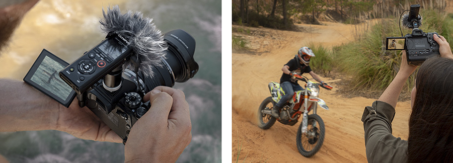 Al grabar sonido para vídeo, la grabadora LS puede utilizarse como un dispositivo independiente o, por medio del adaptador de montura incluido (Olympus SM2) y el cable de 3,5 mm (Olympus KA335), utilizarlo a modo de micrófono externo situado en la parte superior de la cámara para evitar esfuerzos de sincronización en la postproducción. El filtro antiviento incluido ofrece protección contra el ruido del viento al grabar en exteriores.