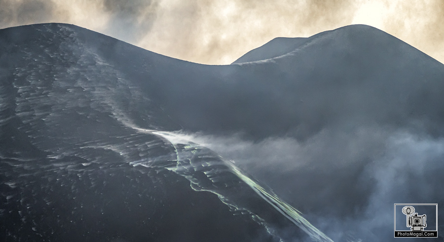 La erupción había cambiado mucho de una visita a otra, ahora al ser el cráter más grande, los ríos de lava caían de atrás a delante y eran realmente espectaculares, especialmente durante la noche, el tremor era algo menos intenso, sin embargo el flujo de lava era mayor, era impresionante ver a los grandes bloques de material volcánico que se deslizaban sobre las cascadas de lava. Unos días después supimos que eran los últimos “estertores” del volcán, estábamos siendo testigos del final de la erupción del volcán Sin Nombre.